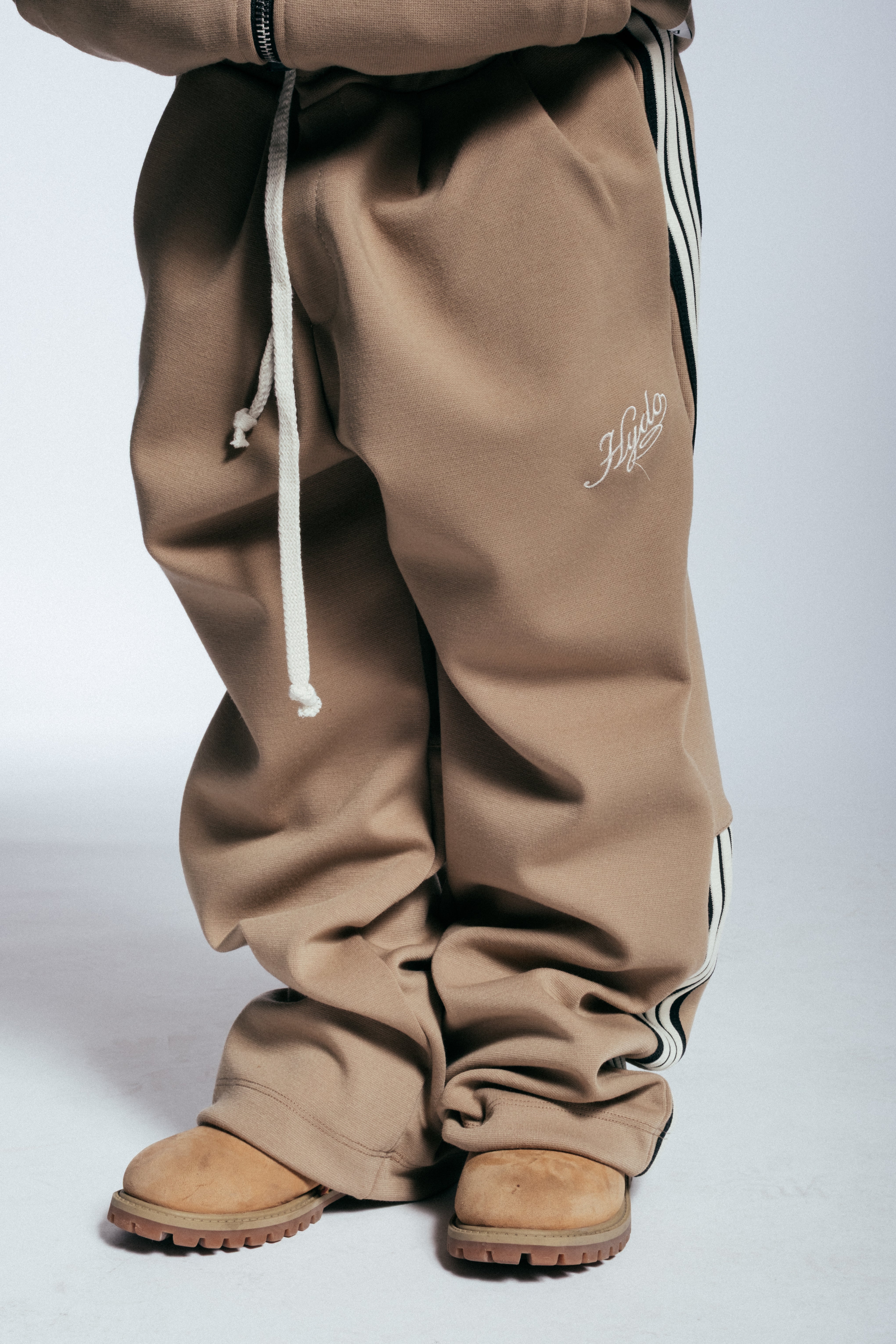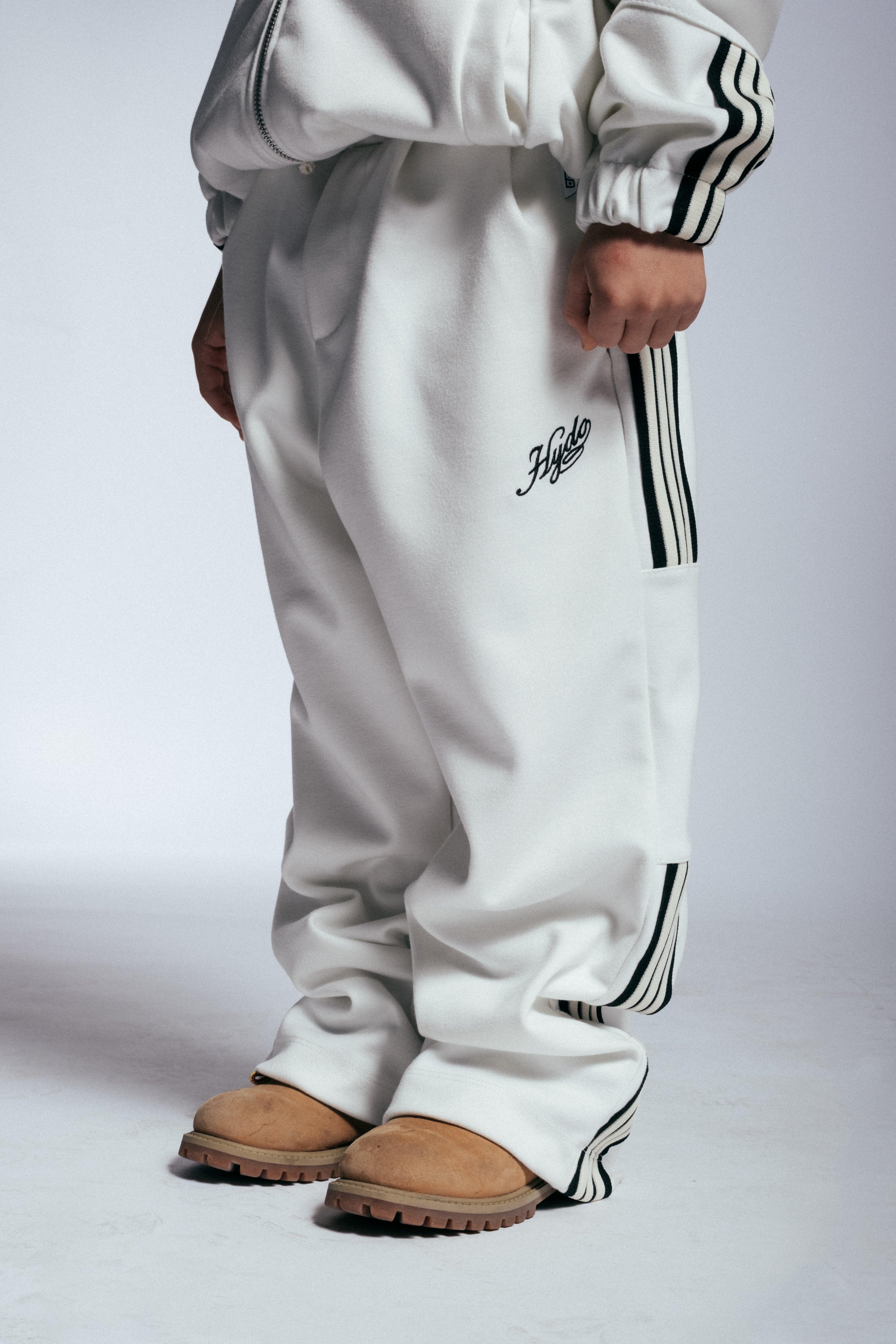 HYDO lavora con una varietà di materiali tra cui cotone, denim, tessuti tecnici e fibre elasticizzate.